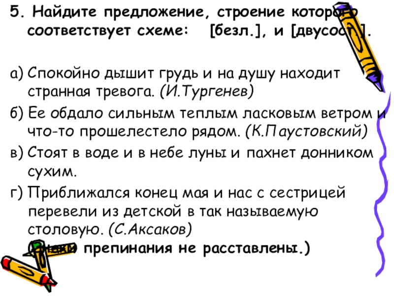 Слайд 185. Найдите предложение, строение которого соответствует схеме: [безл.], и [двусост.].
