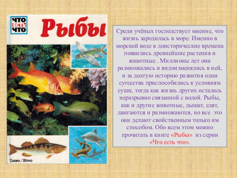 морской воде в доисторические времена появились древнейшие растения и животные . Миллионы лет они размножались и видоизменялись в ней, и за долгую историю развития одни существа приспособились к условиям суши, тогда как жизнь других осталась неразрывно связанной с водой. Рыбы, как и другие животные, дышат, едят, двигаются и размножаются, но все это они делают свойственным только им способом. Обо всем этом можно прочитать в книге «Рыбы» из серии «Что есть что».
