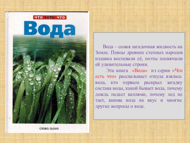 Эта книга «Вода» из серии «Что есть что» рассказывает откуда взялась вода, кто первым раскрыл загадку состава воды, какой бывает вода, почему дождь падает каплями, почему лед не тает, какова вода на вкус и многие другие вопросы о воде.