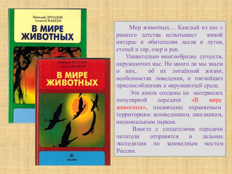 Эти книги созданы на материалах популярной передачи «В мире животных», посвящены охраняемым территориям: заповедникам, заказникам, национальным паркам.