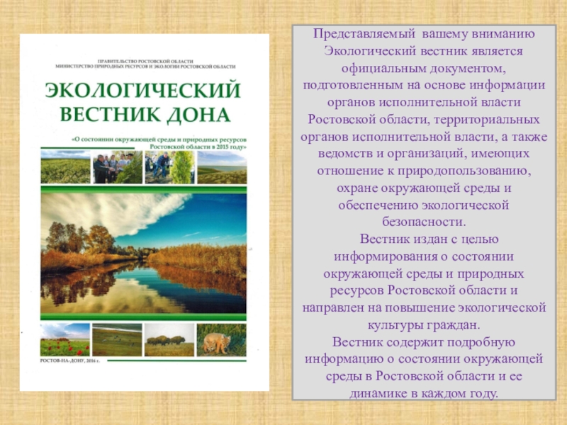 Представляемый вашему вниманию Экологический вестник является официальным документом, подготовленным