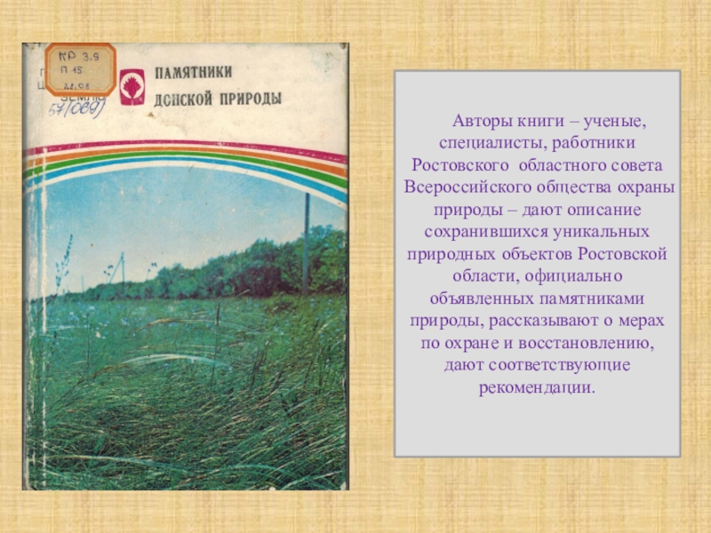 совета Всероссийского общества охраны природы – дают описание сохранившихся уникальных природных объектов Ростовской области, официально объявленных памятниками природы, рассказывают о мерах по охране и восстановлению, дают соответствующие рекомендации.