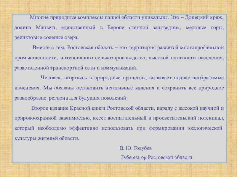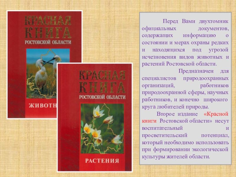 Второе издание Красной книги Ростовской области, наряду с высокой научной и природоохранной значимостью, несет воспитательный и просветительский потенциал, который необходимо эффективно использовать при формировании экологической культуры жителей области.