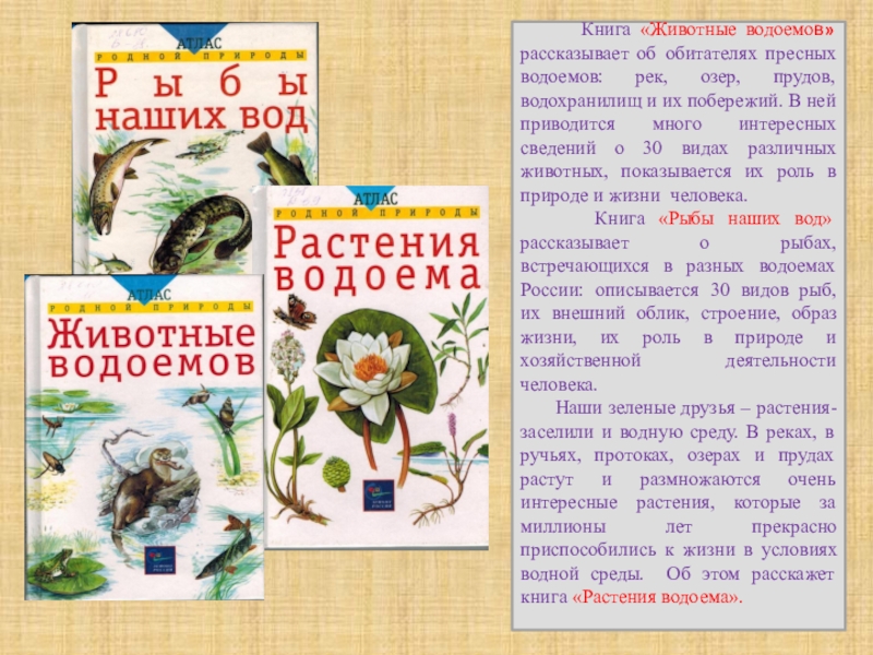 водоемов: рек, озер, прудов, водохранилищ и их побережий. В ней приводится много интересных сведений о 30 видах различных животных, показывается их роль в природе и жизни человека.