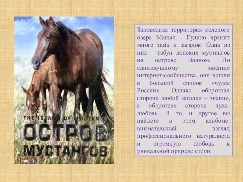 загадок. Одна из них – табун донских мустангов на острове Водном. По единодушному мнению интернет-сообщества, они вошли в большой список «чудес России». Однако оборотная сторона любой загадки – знание, а оборотная сторона чуда- любовь. И то, и другое вы найдете в этом альбоме: внимательный взгляд профессионального натуралиста и огромную любовь к уникальной природе степи.