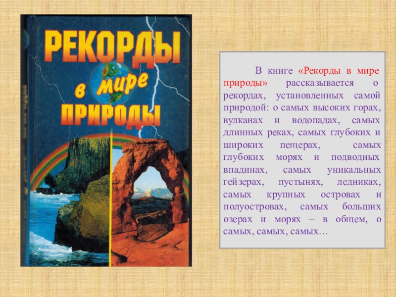 рекордах, установленных самой природой: о самых высоких горах, вулканах и водопадах, самых длинных реках, самых глубоких и широких пещерах, самых глубоких морях и подводных впадинах, самых уникальных гейзерах, пустынях, ледниках, самых крупных островах и полуостровах, самых больших озерах и морях – в общем, о самых, самых, самых…
