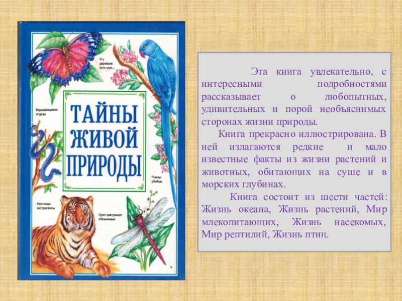 Книга состоит из шести частей: Жизнь океана, Жизнь растений, Мир млекопитающих, Жизнь насекомых, Мир рептилий, Жизнь птиц.