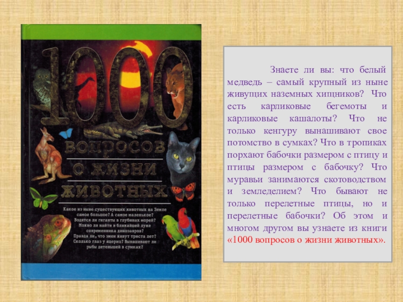 самый крупный из ныне живущих наземных хищников? Что есть карликовые бегемоты и карликовые кашалоты? Что не только кенгуру вынашивают свое потомство в сумках? Что в тропиках порхают бабочки размером с птицу и птицы размером с бабочку? Что муравьи занимаются скотоводством и земледелием? Что бывают не только перелетные птицы, но и перелетные бабочки? Об этом и многом другом вы узнаете из книги «1000 вопросов о жизни животных».