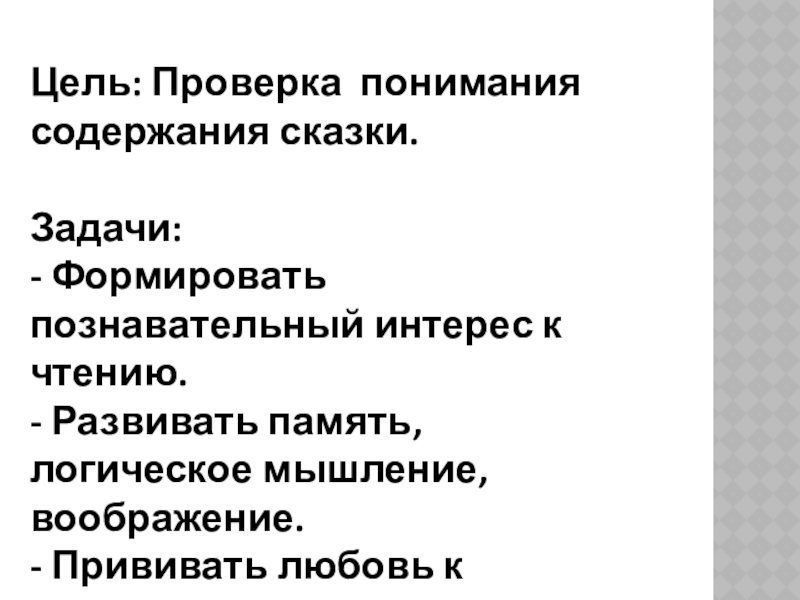 Слайд 23Цель: Проверка понимания содержания сказки.