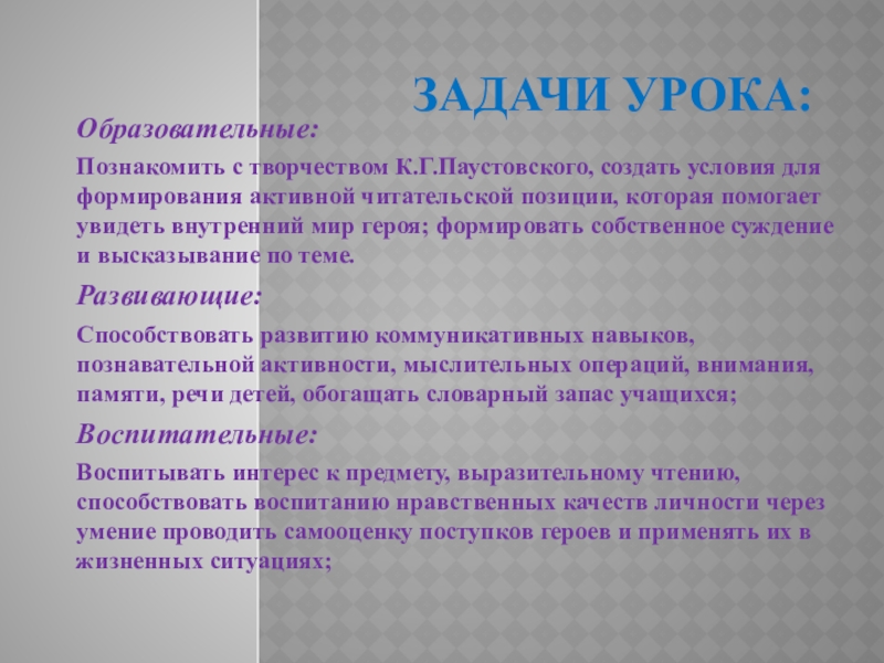 Познакомить с творчеством К.Г.Паустовского, создать условия для формирования активной