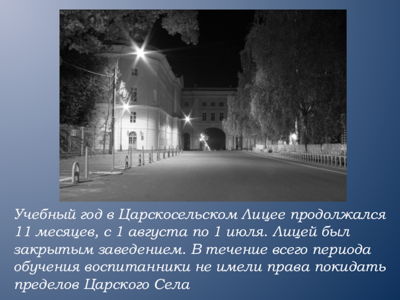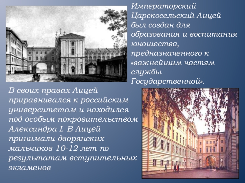 В своих правах Лицей приравнивался к российским университетам и находился под особым покровительством Александра I. В Лицей принимали дворянских мальчиков 10-12 лет по результатам вступительных экзаменов