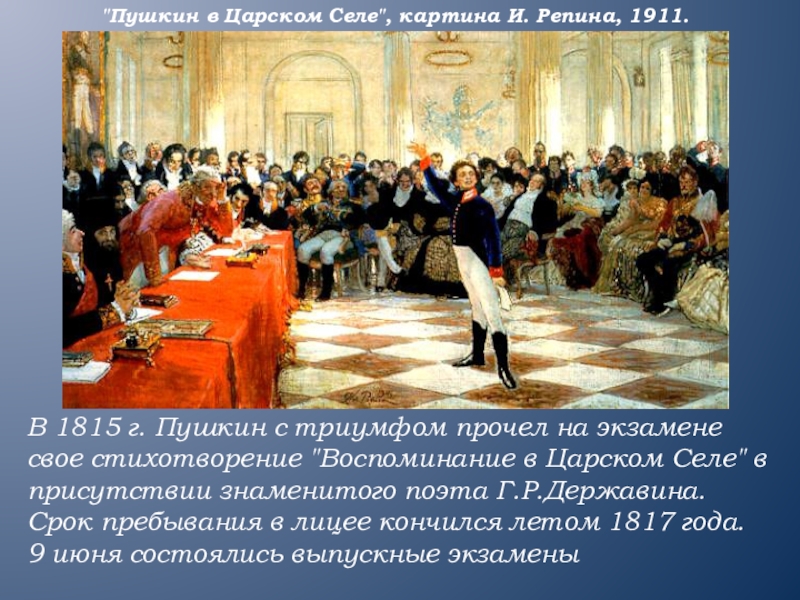 "Пушкин в Царском Селе", картина И. Репина, 1911.