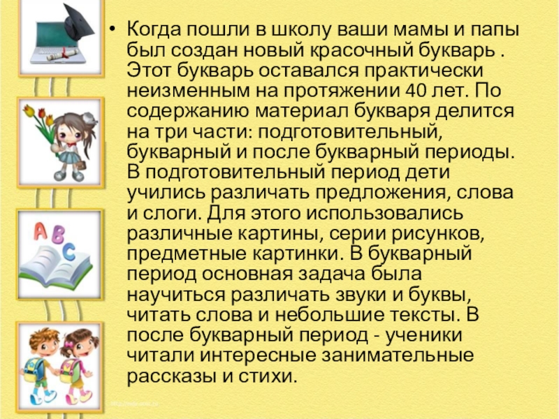 красочный букварь . Этот букварь оставался практически неизменным на протяжении 40 лет. По содержанию материал букваря делится на три части: подготовительный, букварный и после букварный периоды. В подготовительный период дети учились различать предложения, слова и слоги. Для этого использовались различные картины, серии рисунков, предметные картинки. В букварный период основная задача была научиться различать звуки и буквы, читать слова и небольшие тексты. В после букварный период - ученики читали интересные занимательные рассказы и стихи.