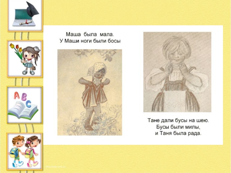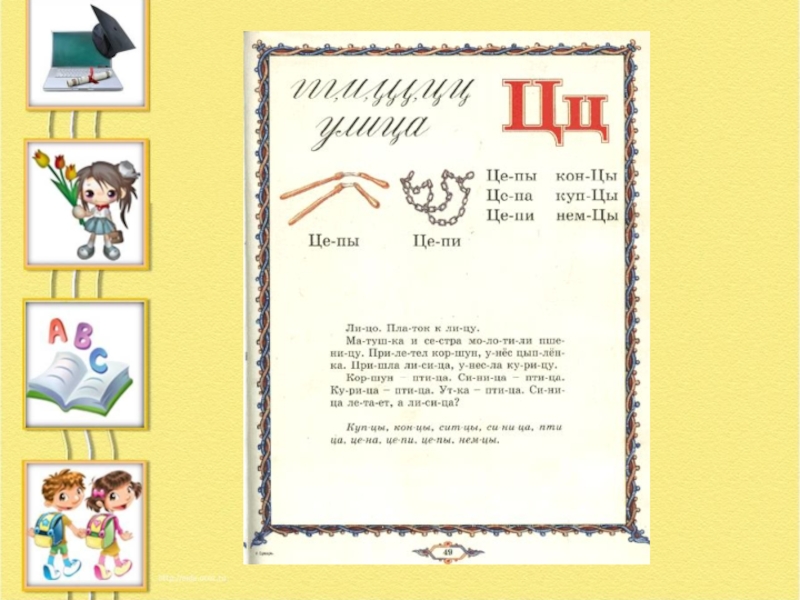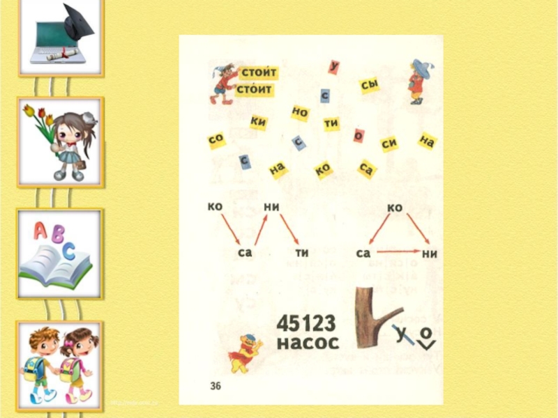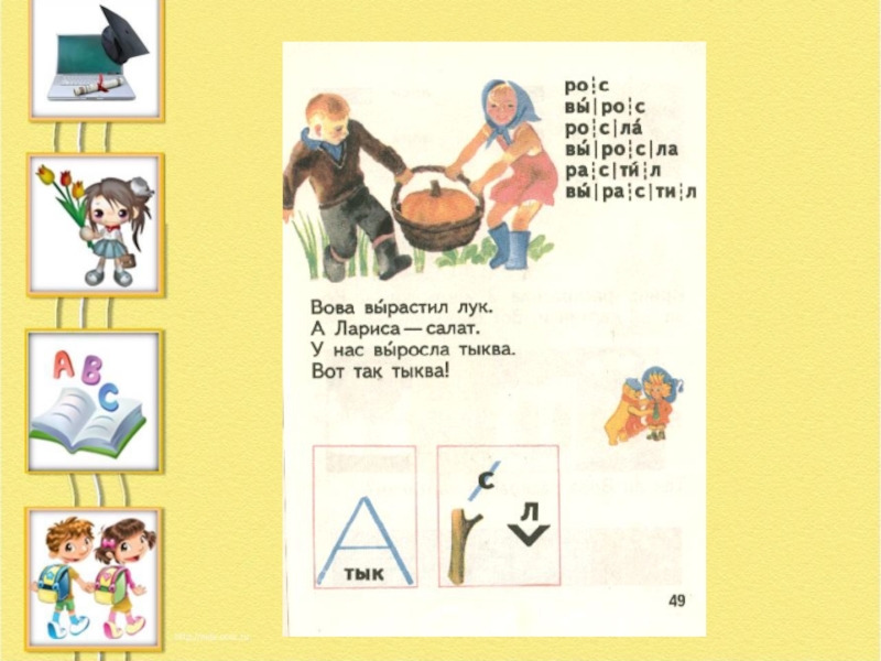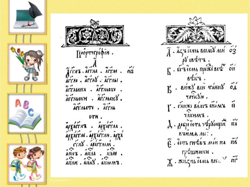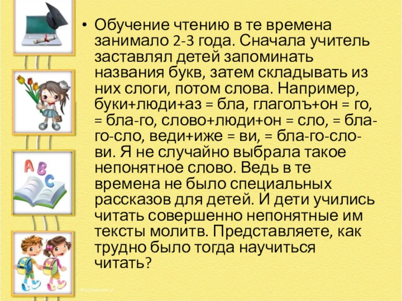 детей запоминать названия букв, затем складывать из них слоги, потом слова. Например, буки+люди+аз = бла, глаголъ+он = го, = бла-го, слово+люди+он = сло, = бла-го-сло, веди+иже = ви, = бла-го-сло-ви. Я не случайно выбрала такое непонятное слово. Ведь в те времена не было специальных рассказов для детей. И дети учились читать совершенно непонятные им тексты молитв. Представляете, как трудно было тогда научиться читать?