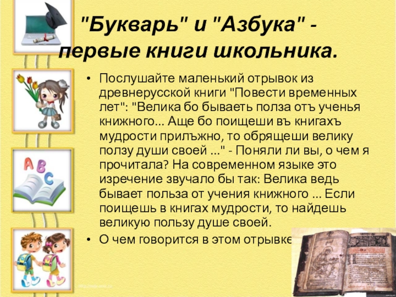 книги "Повести временных лет": "Велика бо бываеть полза отъ ученья книжного... Аще бо поищеши въ книгахъ мудрости прилъжно, то обрящеши велику ползу души своей ..." - Поняли ли вы, о чем я прочитала? На современном языке это изречение звучало бы так: Велика ведь бывает польза от учения книжного ... Если поищешь в книгах мудрости, то найдешь великую пользу душе своей.