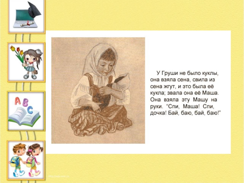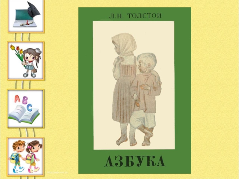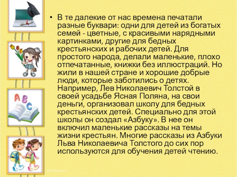 детей из богатых семей - цветные, с красивыми нарядными картинками, другие для бедных крестьянских и рабочих детей. Для простого народа, делали маленькие, плохо отпечатанные, книжки без иллюстраций. Но жили в нашей стране и хорошие добрые люди, которые заботились о детях. Например, Лев Николаевич Толстой в своей усадьбе Ясная Поляна, на свои деньги, организовал школу для бедных крестьянских детей. Специально для этой школы он создал «Азбуку». В нее он включил маленькие рассказы на темы жизни крестьян. Многие рассказы из Азбуки Льва Николаевича Толстого до сих пор используются для обучения детей чтению.
