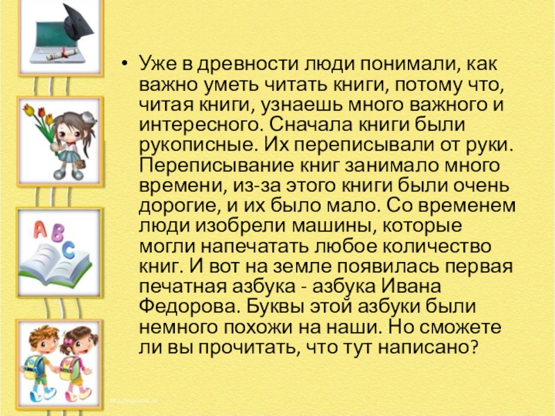 что, читая книги, узнаешь много важного и интересного. Сначала книги были рукописные. Их переписывали от руки. Переписывание книг занимало много времени, из-за этого книги были очень дорогие, и их было мало. Со временем люди изобрели машины, которые могли напечатать любое количество книг. И вот на земле появилась первая печатная азбука - азбука Ивана Федорова. Буквы этой азбуки были немного похожи на наши. Но сможете ли вы прочитать, что тут написано?