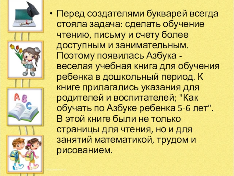 Слайд 26Перед создателями букварей всегда стояла задача: сделать обучение чтению, письму и