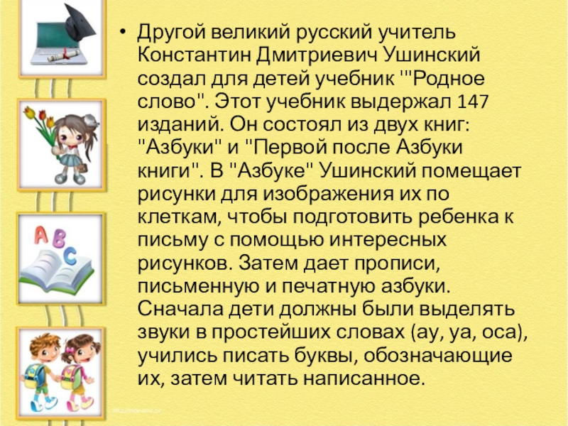 '"Родное слово". Этот учебник выдержал 147 изданий. Он состоял из двух книг: "Азбуки" и "Первой после Азбуки книги". В "Азбуке" Ушинский помещает рисунки для изображения их по клеткам, чтобы подготовить ребенка к письму с помощью интересных рисунков. Затем дает прописи, письменную и печатную азбуки. Сначала дети должны были выделять звуки в простейших словах (ау, уа, оса), учились писать буквы, обозначающие их, затем читать написанное.