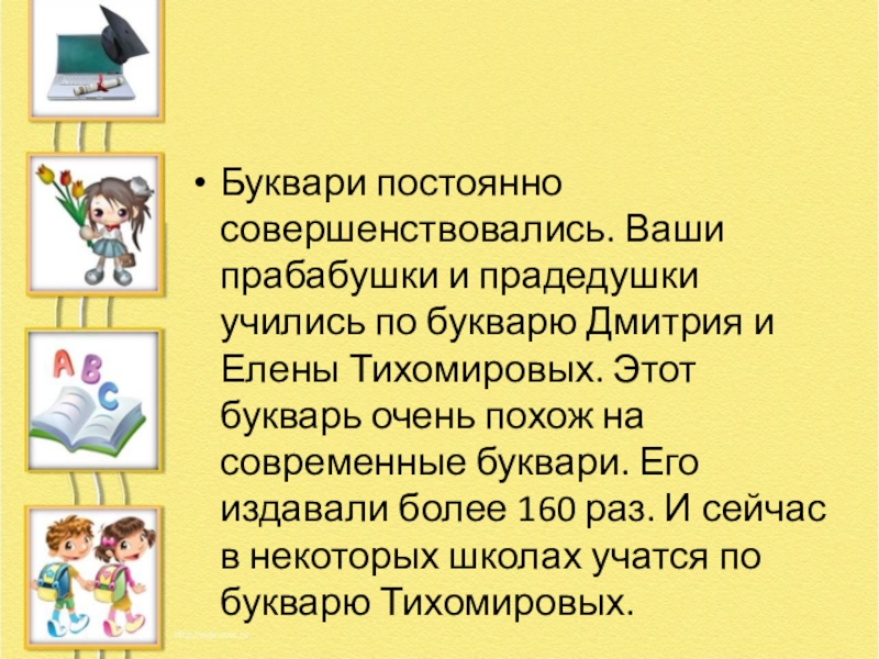 и Елены Тихомировых. Этот букварь очень похож на современные буквари. Его издавали более 160 раз. И сейчас в некоторых школах учатся по букварю Тихомировых.