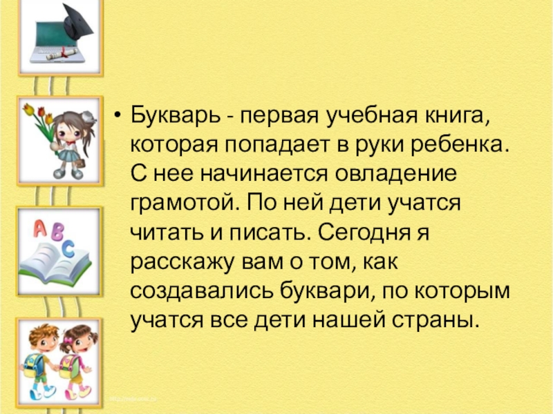 нее начинается овладение грамотой. По ней дети учатся читать и писать. Сегодня я расскажу вам о том, как создавались буквари, по которым учатся все дети нашей страны.