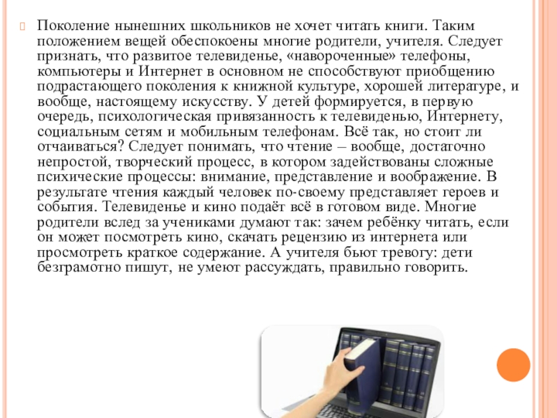Слайд 2Поколение нынешних школьников не хочет читать книги. Таким положением вещей обеспокоены