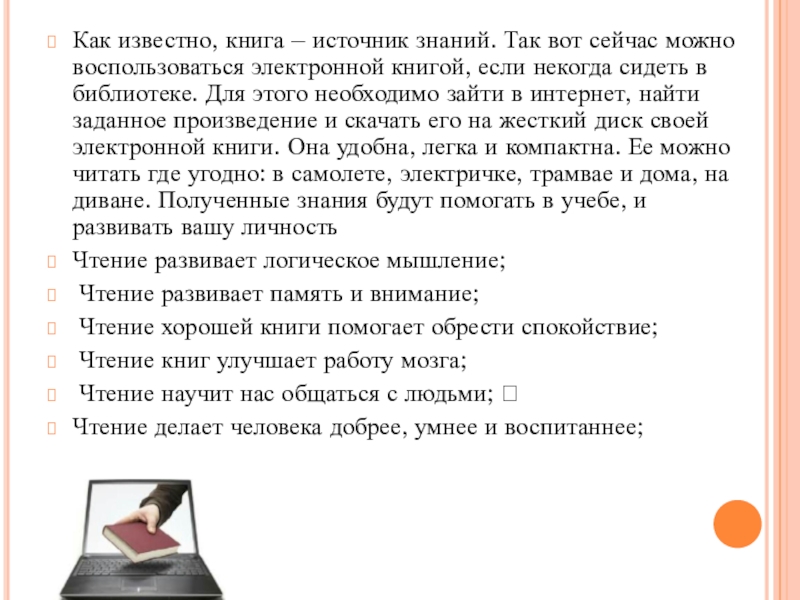 электронной книгой, если некогда сидеть в библиотеке. Для этого необходимо зайти в интернет, найти заданное произведение и скачать его на жесткий диск своей электронной книги. Она удобна, легка и компактна. Ее можно читать где угодно: в самолете, электричке, трамвае и дома, на диване. Полученные знания будут помогать в учебе, и развивать вашу личность