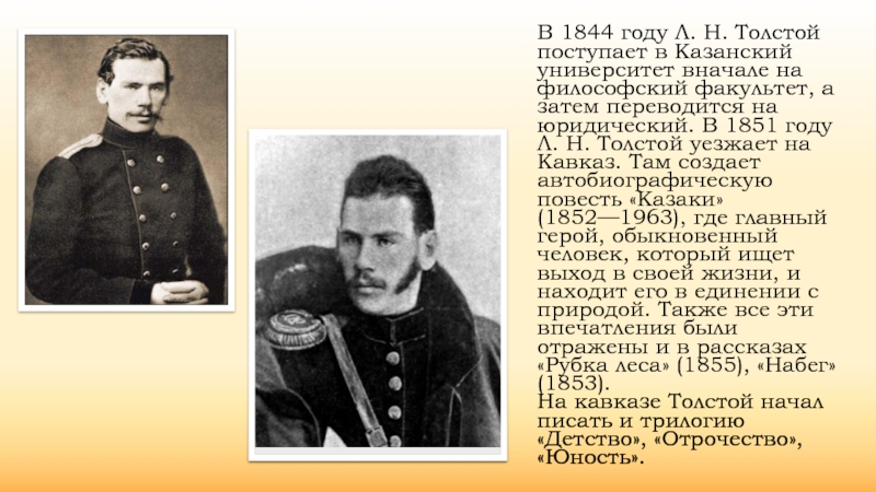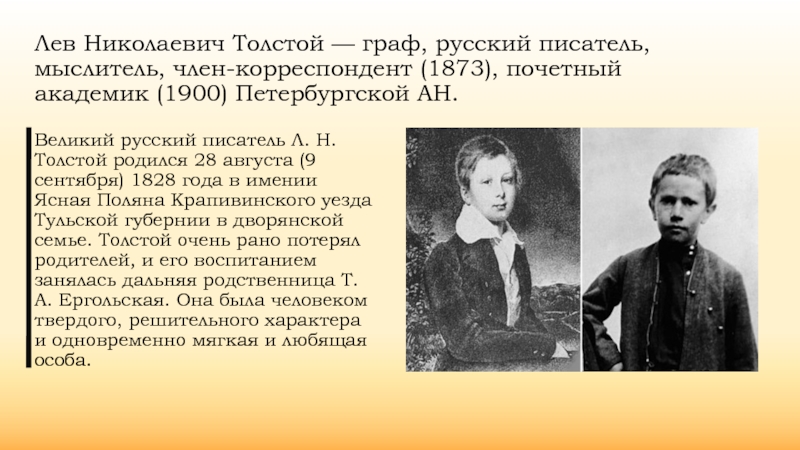 Великий русский писатель Л. Н. Толстой родился 28 августа (9 сентября) 1828 года в имении Ясная Поляна Крапивинского уезда Тульской губернии в дворянской семье. Толстой очень рано потерял родителей, и его воспитанием занялась дальняя родственница Т. А. Ергольская. Она была человеком твердого, решительного характера и одновременно мягкая и любящая особа.