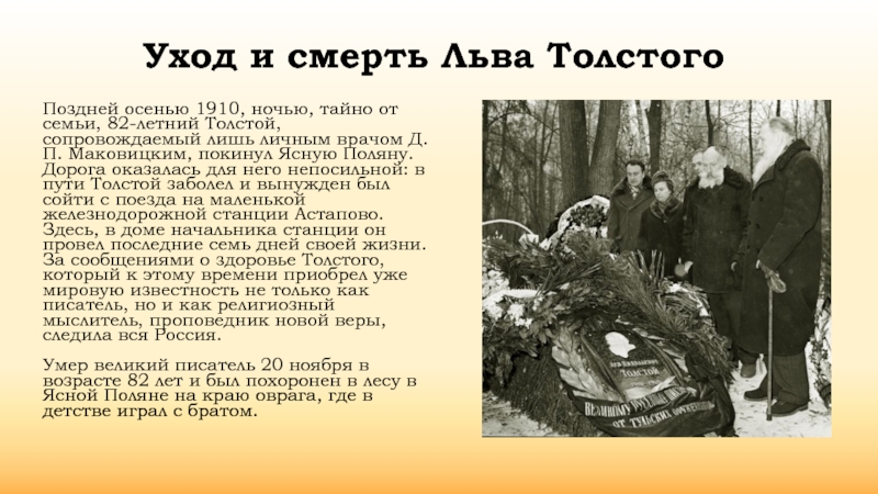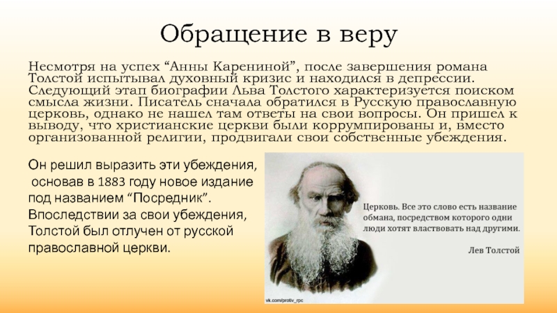 Впоследствии за свои убеждения, Толстой был отлучен от русской православной церкви.