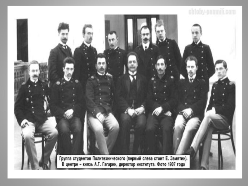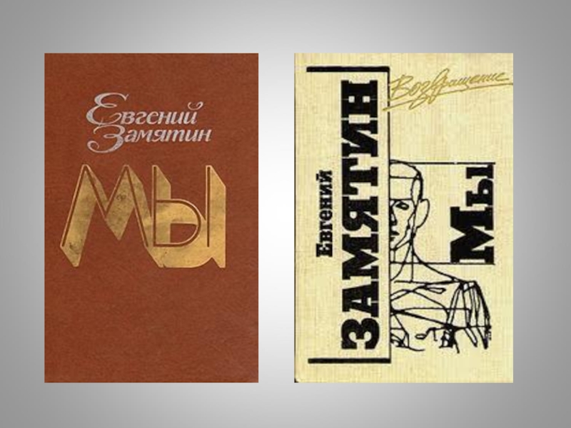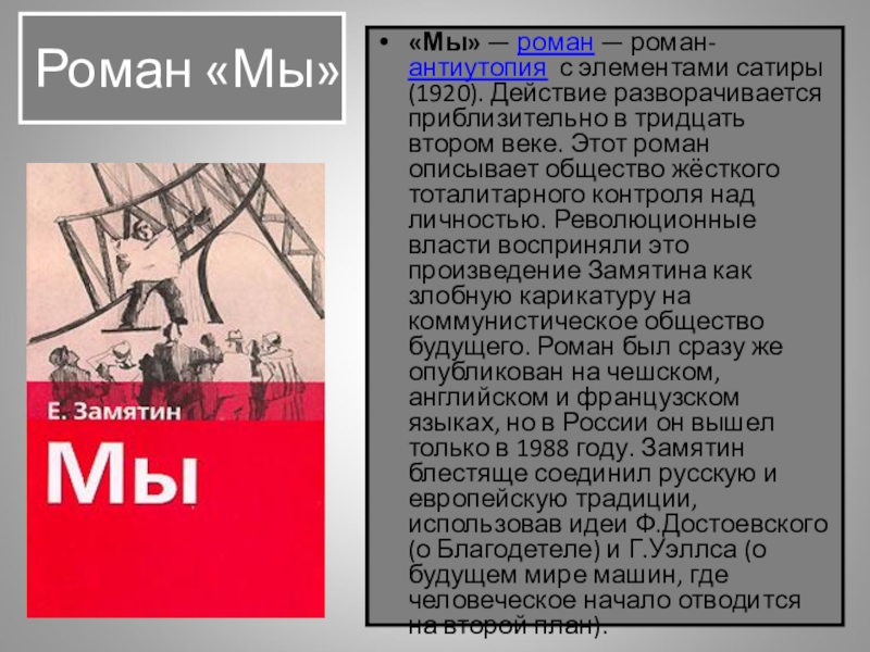 в тридцать втором веке. Этот роман описывает общество жёсткого тоталитарного контроля над личностью. Революционные власти восприняли это произведение Замятина как злобную карикатуру на коммунистическое общество будущего. Роман был сразу же опубликован на чешском, английском и французском языках, но в России он вышел только в 1988 году. Замятин блестяще соединил русскую и европейскую традиции, использовав идеи Ф.Достоевского (о Благодетеле) и Г.Уэллса (о будущем мире машин, где человеческое начало отводится на второй план).