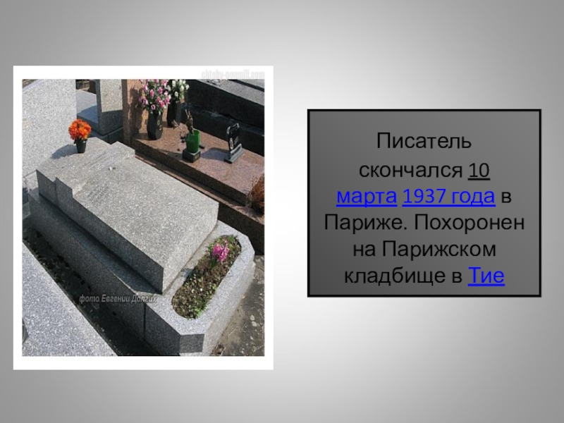 Слайд 13Писатель скончался 10 марта 1937 года в Париже. Похоронен на Парижском кладбище в Тие