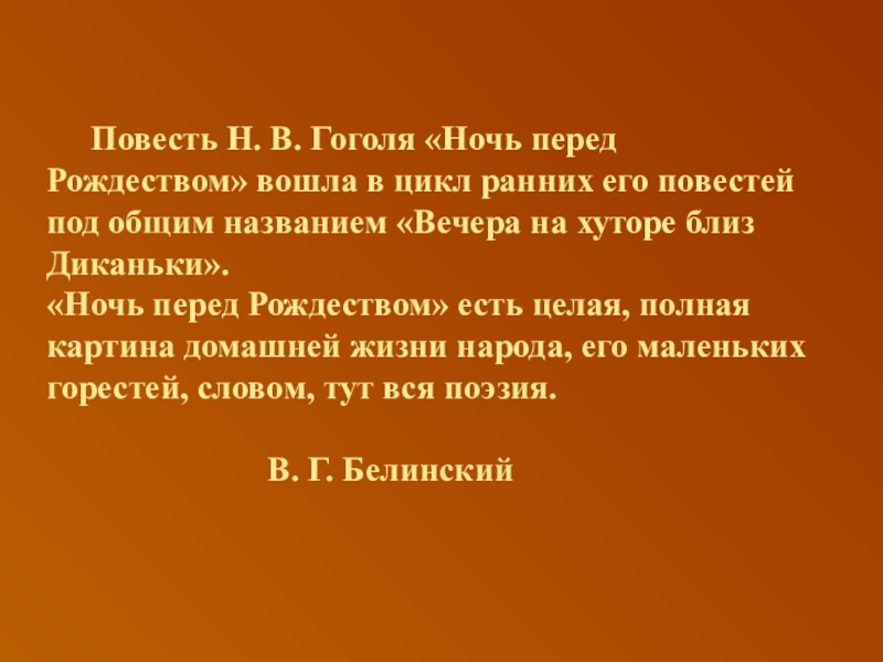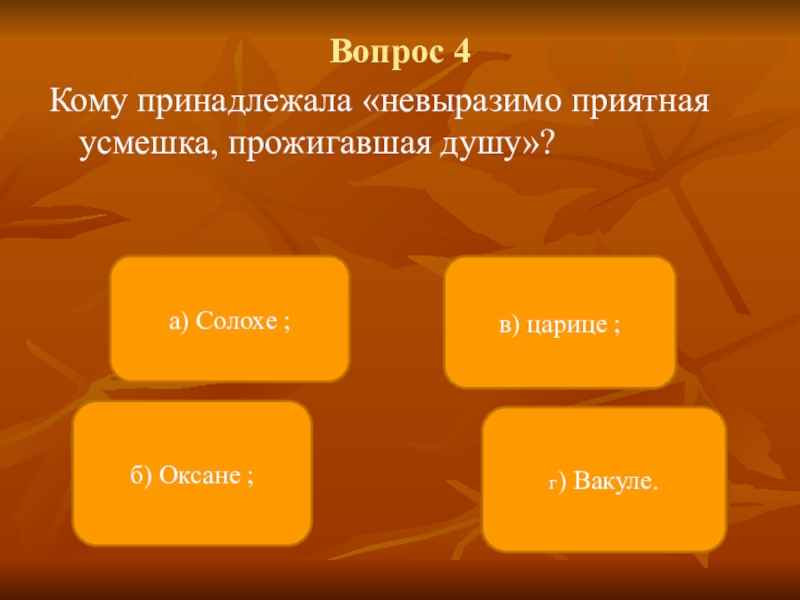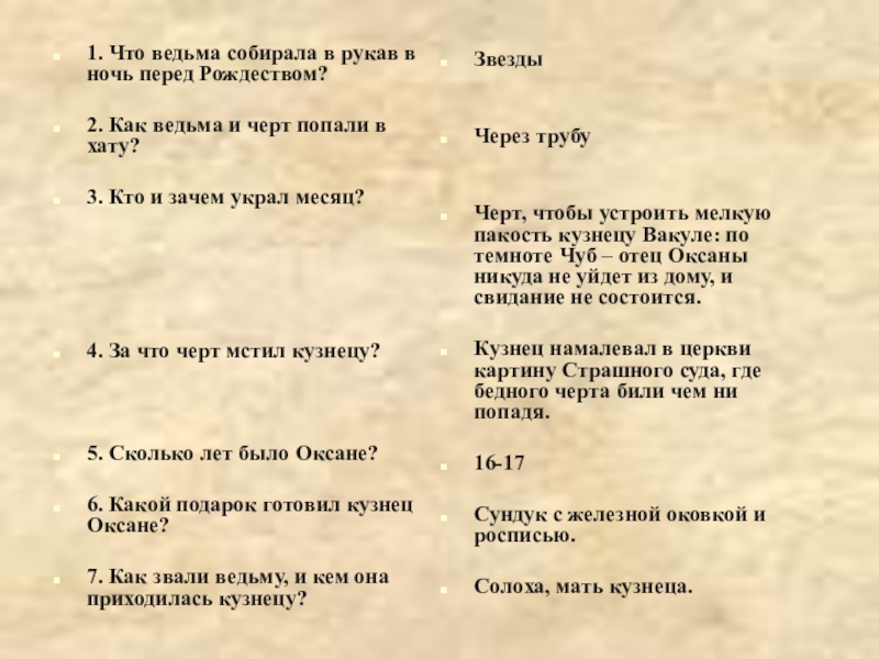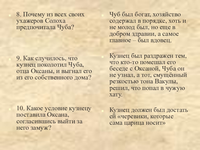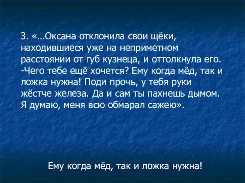Принёс Чубу новёхонькую шапку и красивый пояс, повалился в ноги и сказал: «Помилуй, батько! Не гневись! Вот тебе и нагайка, бей, сколько душа пожелает…Отдай, батько, за меня Оксану».