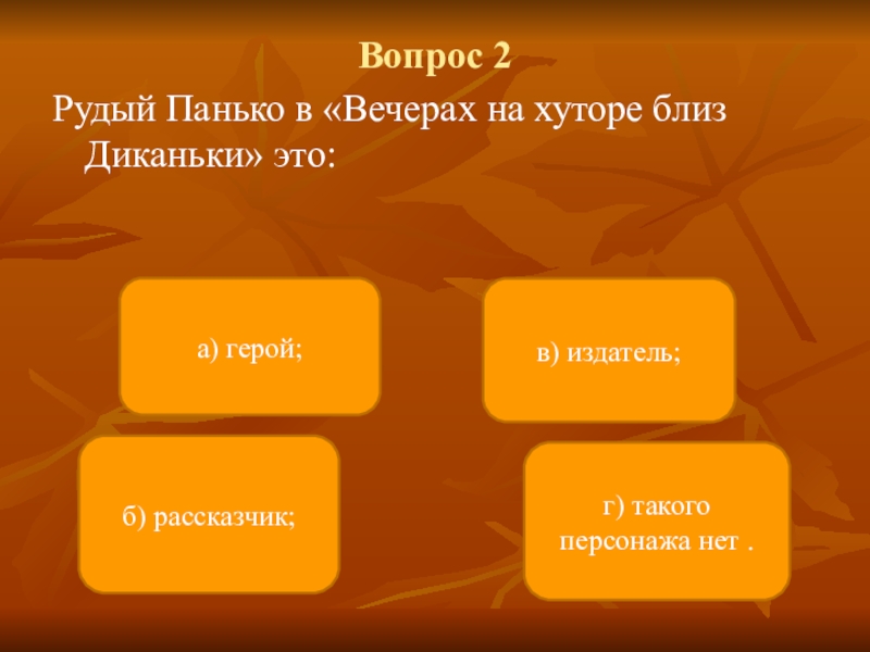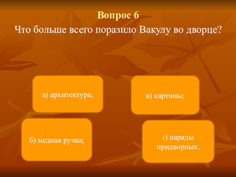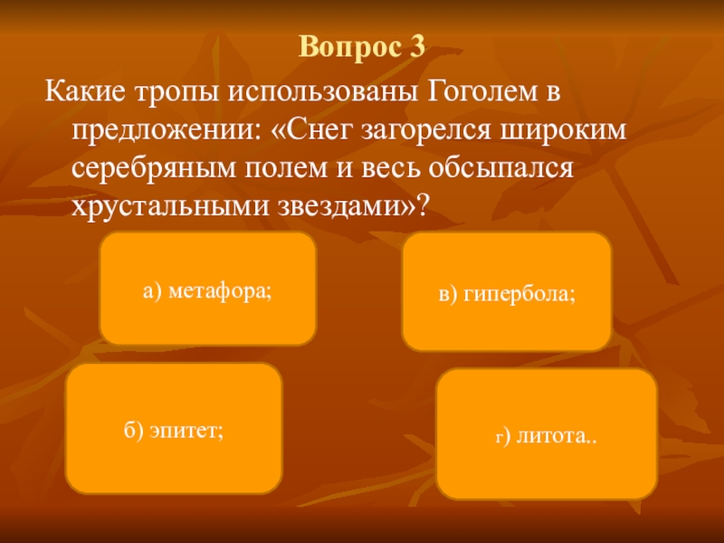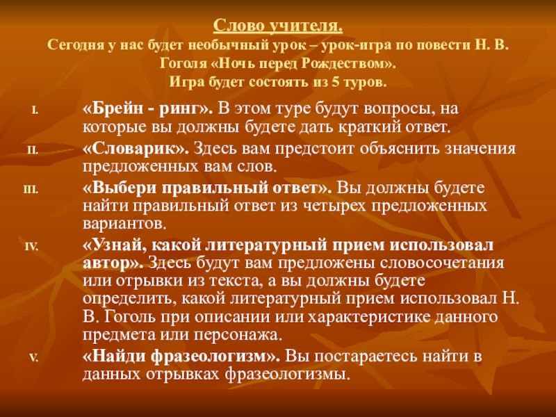 «Узнай, какой литературный прием использовал автор». Здесь будут вам предложены словосочетания или отрывки из текста, а вы должны будете определить, какой литературный прием использовал Н. В. Гоголь при описании или характеристике данного предмета или персонажа.