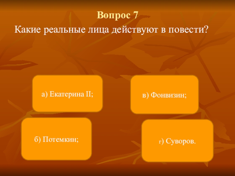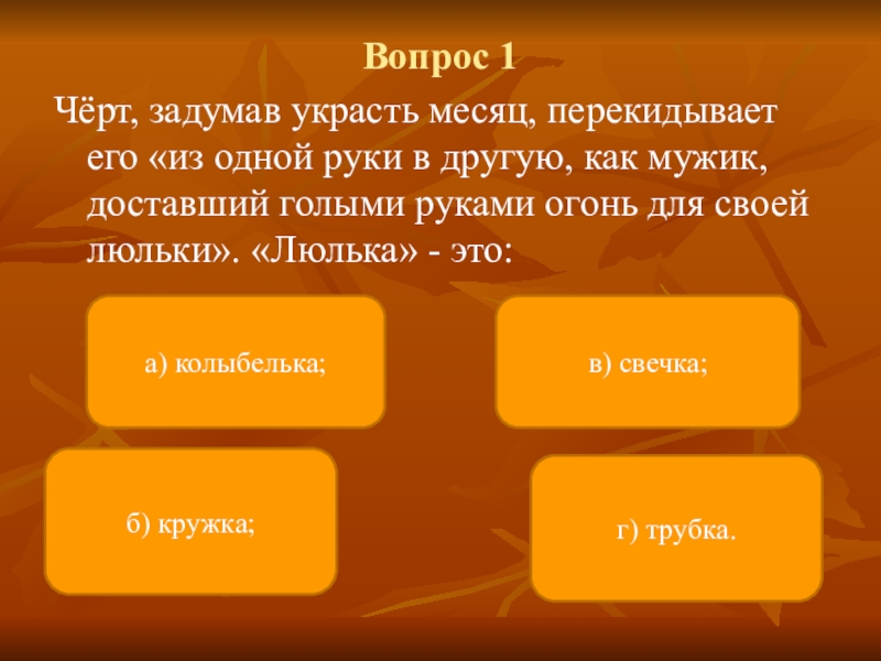 «Выбери правильный ответ». Вы должны будете найти правильный ответ из четырех предложенных вариантов.
