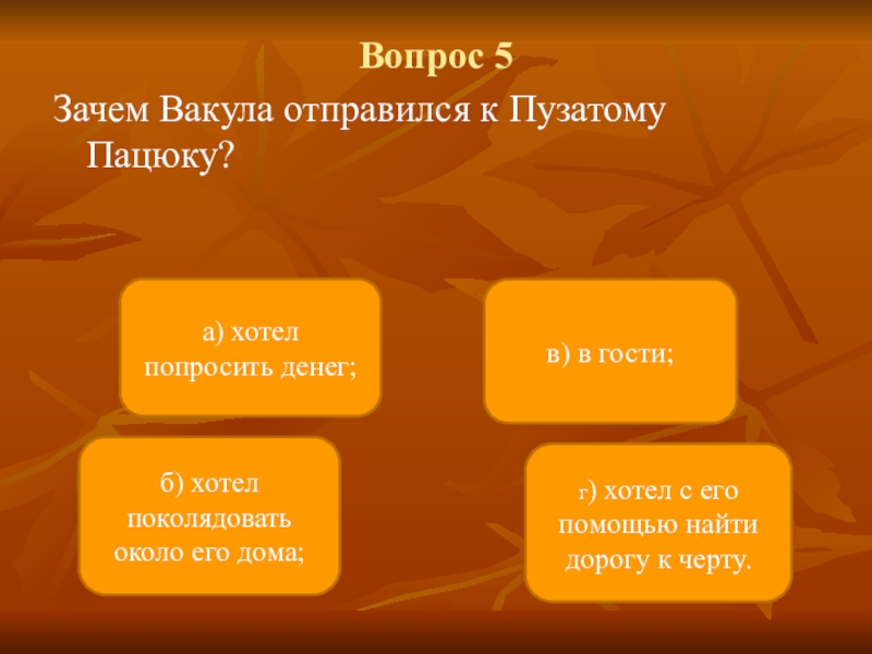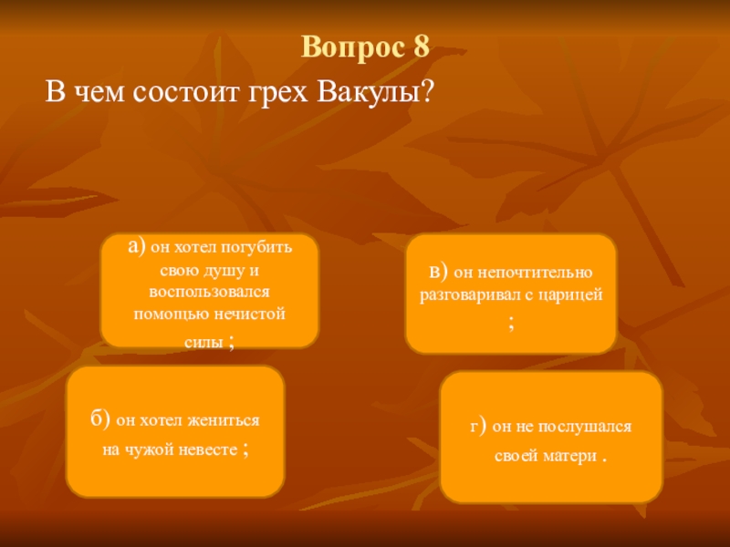 Черт, чтобы устроить мелкую пакость кузнецу Вакуле: по темноте Чуб – отец Оксаны никуда не уйдет из дому, и свидание не состоится.