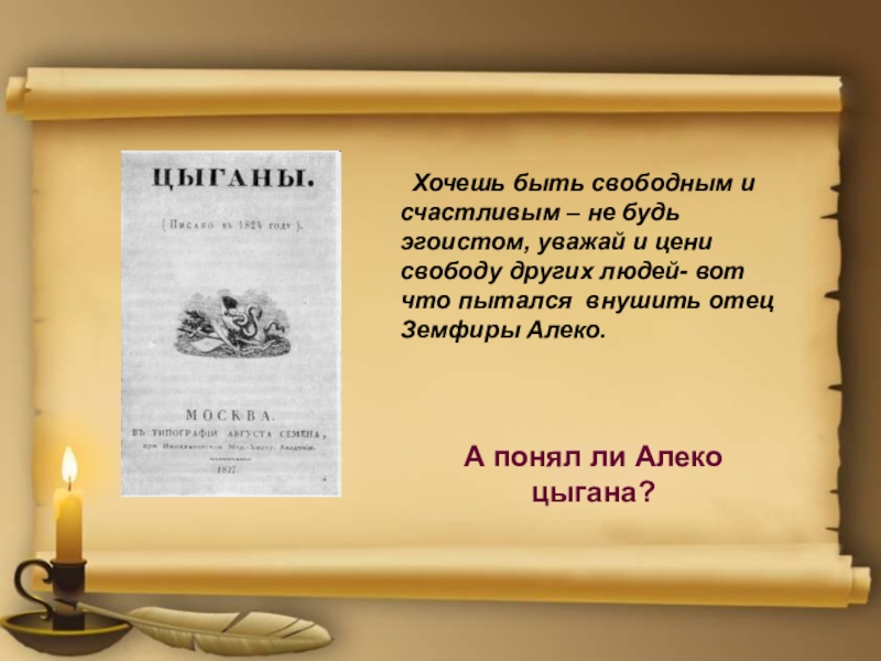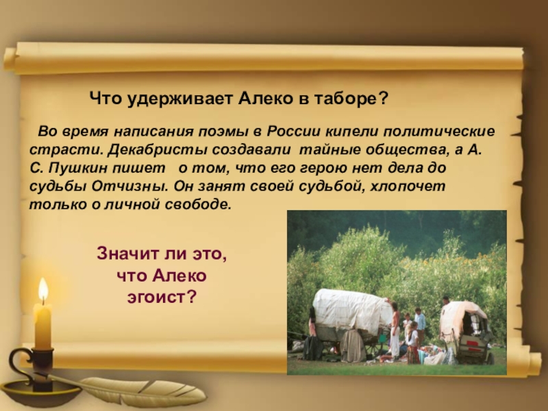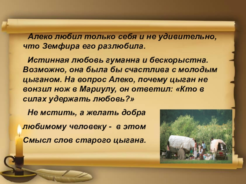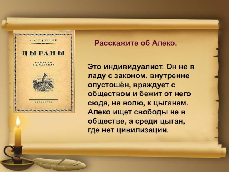 - Что Алеко ищет, а что находит в цыганском таборе? От чего бежит? Найдите в тексте.