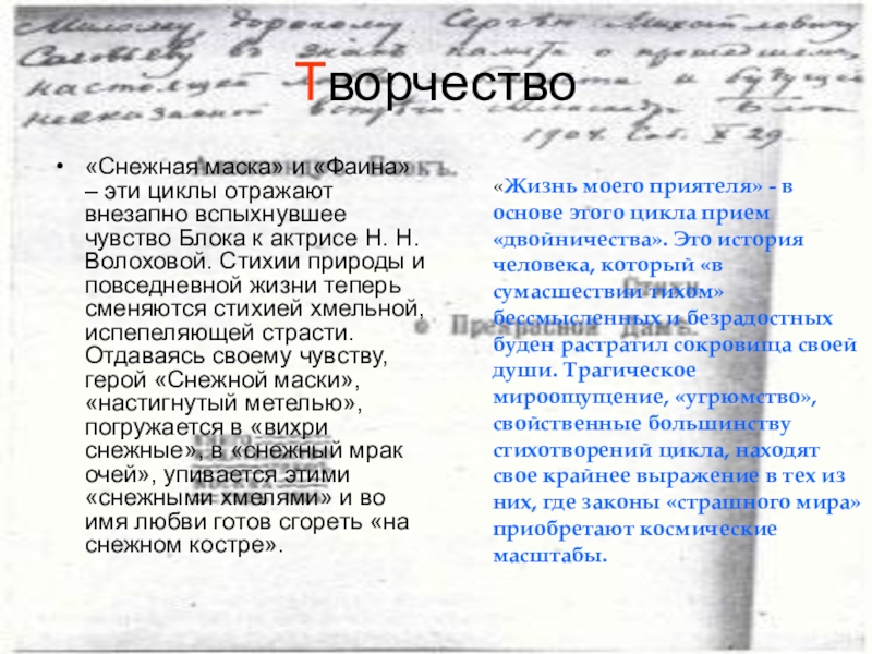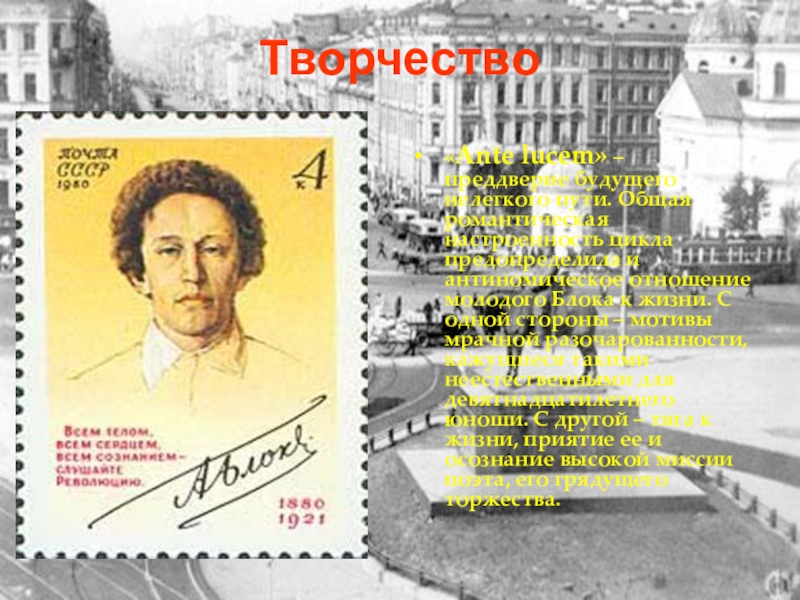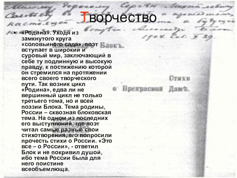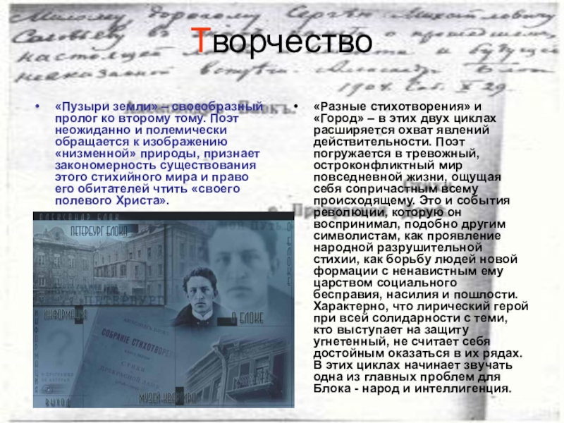 «Разные стихотворения» и «Город» – в этих двух циклах расширяется охват явлений действительности. Поэт погружается в тревожный, остроконфликтный мир повседневной жизни, ощущая себя сопричастным всему происходящему. Это и события революции, которую он воспринимал, подобно другим символистам, как проявление народной разрушительной стихии, как борьбу людей новой формации с ненавистным ему царством социального бесправия, насилия и пошлости. Характерно, что лирический герой при всей солидарности с теми, кто выступает на защиту угнетенный, не считает себя достойным оказаться в их рядах. В этих циклах начинает звучать одна из главных проблем для Блока - народ и интеллигенция.