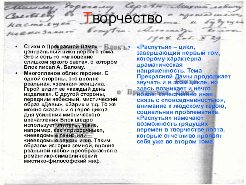 «Распутья» – цикл, завершающий первый том, которому характерна драматическая напряженность. Тема Прекрасной Дамы продолжает звучать и в этом цикле, но здесь возникает и нечто новое: качественно иная связь с «повседневностью», внимание к людскому герою, социальная проблематика. «Распутья» намечают возможность грядущих перемен в творчестве поэта, которые отчетливо проявят себя уже во втором томе.