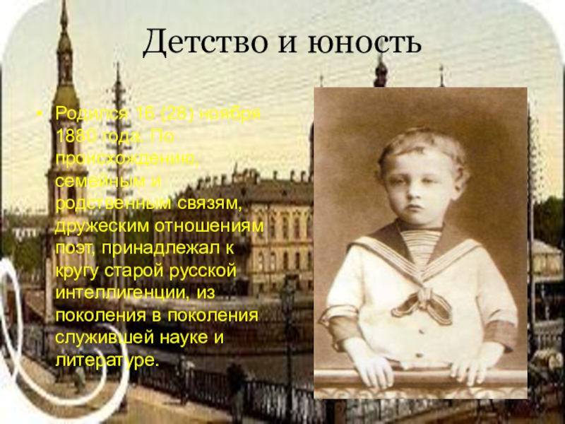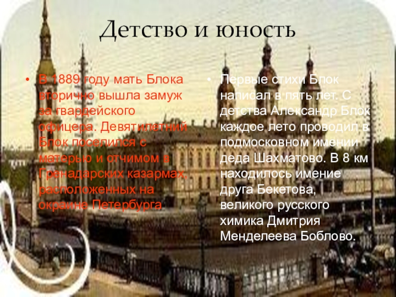 Первые стихи Блок написал в пять лет. С детства Александр Блок каждое лето проводил в подмосковном имении деда Шахматово. В 8 км находилось имение друга Бекетова, великого русского химика Дмитрия Менделеева Боблово.