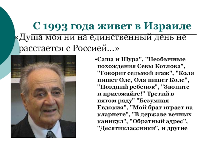 Саша и Шура", "Необычные похождения Севы Котлова", "Говорит седьмой этаж", "Коля пишет Оле, Оля пишет Коле", "Поздний ребенок", "Звоните и приезжайте!" Третий в пятом ряду" "Безумная Евдокия", "Мой брат играет на кларнете", "В державе вечных каникул", "Обратный адрес", "Десятиклассники", и другие