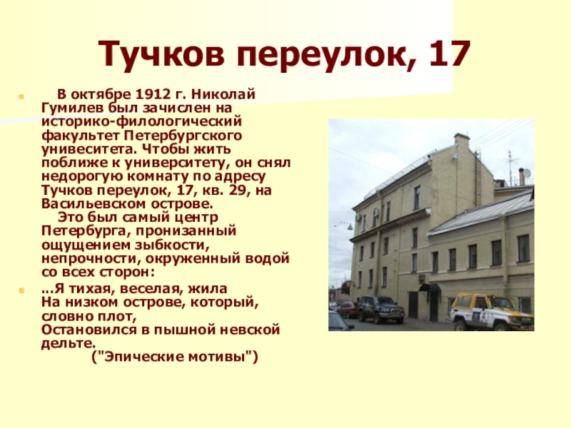 зачислен на историко-филологический факультет Петербургского унивеситета. Чтобы жить поближе к университету, он снял недорогую комнату по адресу Тучков переулок, 17, кв. 29, на Васильевском острове.