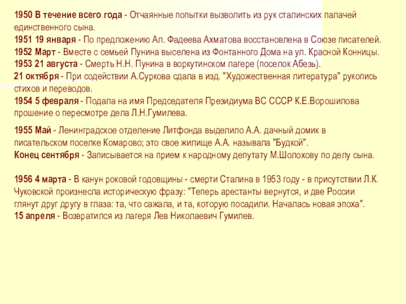 1956 4 марта - В канун роковой годовщины - смерти Сталина в 1953 году - в присутствии Л.К.Чуковской произнесла историческую фразу: "Теперь арестанты вернутся, и две России глянут друг другу в глаза: та, что сажала, и та, которую посадили. Началась новая эпоха".