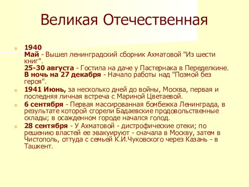 28 сентября - У Ахматовой - дистрофические отеки; по решению властей ее эвакуируют - сначала в Москву, затем в Чистополь, оттуда с семьей К.И.Чуковского через Казань - в Ташкент.