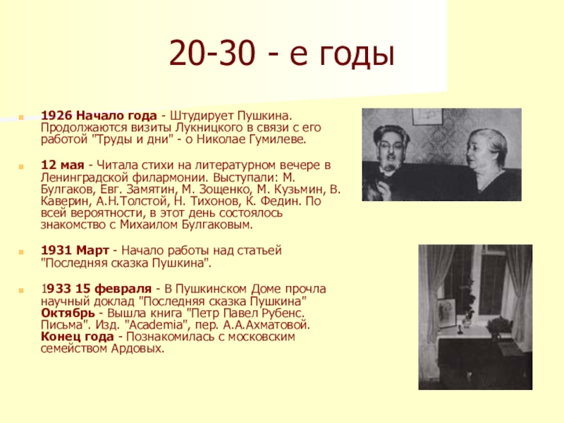 12 мая - Читала стихи на литературном вечере в Ленинградской филармонии. Выступали: М. Булгаков, Евг. Замятин, М. Зощенко, М. Кузьмин, В. Каверин, А.Н.Толстой, Н. Тихонов, К. Федин. По всей вероятности, в этот день состоялось знакомство с Михаилом Булгаковым.
