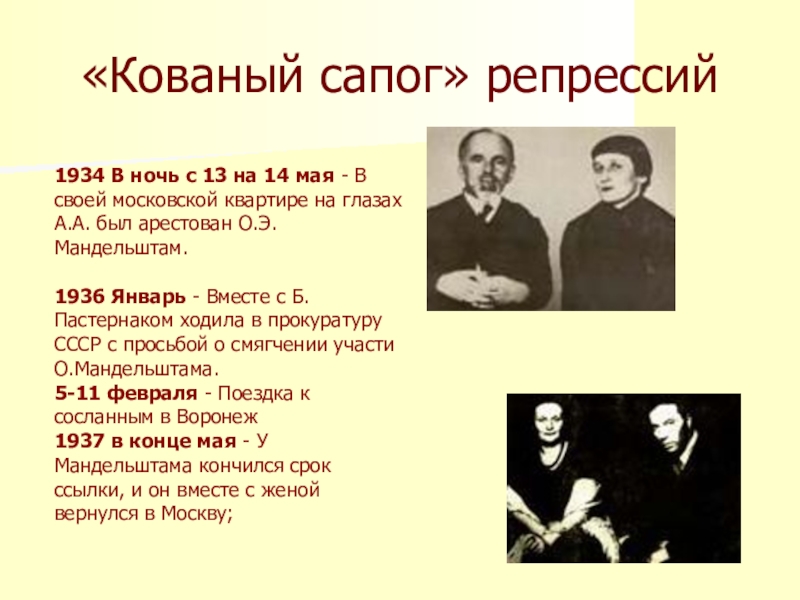 1936 Январь - Вместе с Б.Пастернаком ходила в прокуратуру СССР с просьбой о смягчении участи О.Мандельштама.