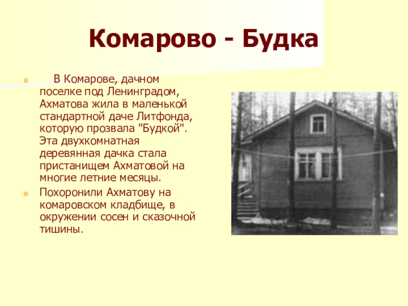 жила в маленькой стандартной даче Литфонда, которую прозвала "Будкой". Эта двухкомнатная деревянная дачка стала пристанищем Ахматовой на многие летние месяцы.