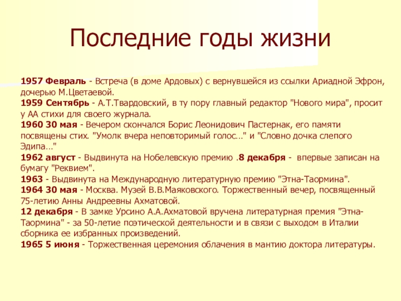 1962 aвгуст - Выдвинута на Нобелевскую премию .8 декабря - впервые записан на бумагу "Реквием".