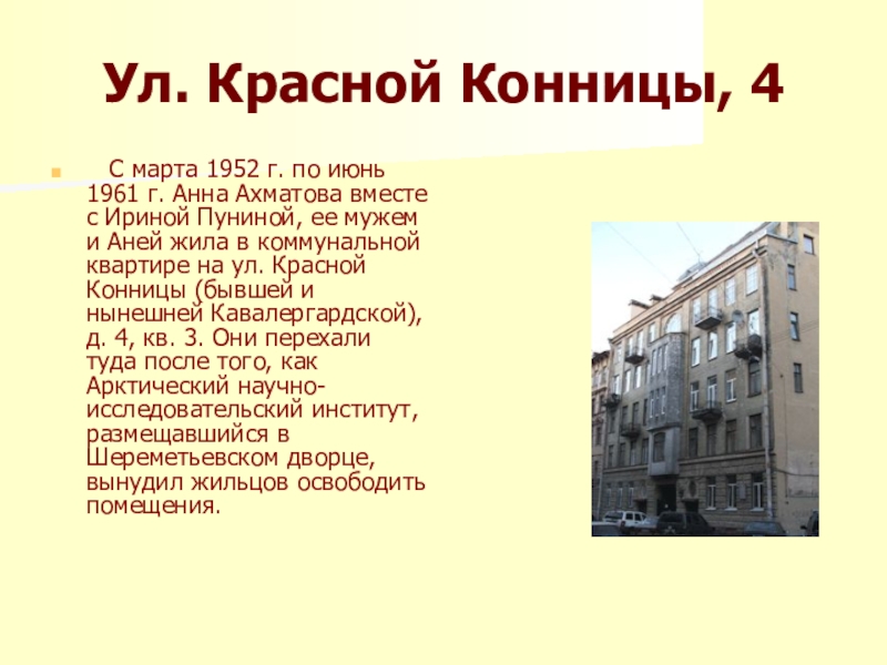 г. Анна Ахматова вместе с Ириной Пуниной, ее мужем и Аней жила в коммунальной квартире на ул. Красной Конницы (бывшей и нынешней Кавалергардской), д. 4, кв. 3. Они перехали туда после того, как Арктический научно-исследовательский институт, размещавшийся в Шереметьевском дворце, вынудил жильцов освободить помещения.