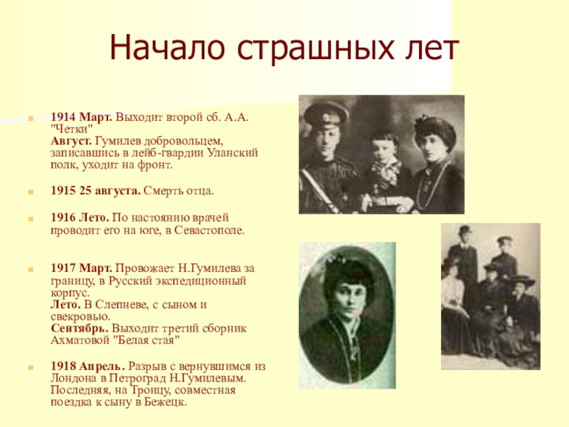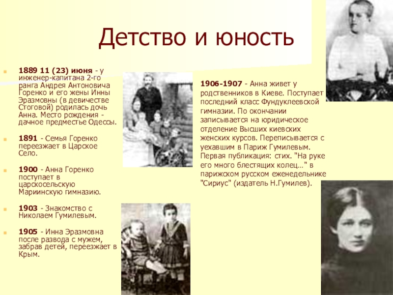 1906-1907 - Анна живет у родственников в Киеве. Поступает в последний класс Фундуклеевской гимназии. По окончании записывается на юридическое отделение Высших киевских женских курсов. Переписывается с уехавшим в Париж Гумилевым. Первая публикация: стих. "На руке его много блестящих колец…" в парижском русском еженедельнике "Сириус" (издатель Н.Гумилев).