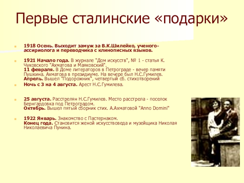 1918 Осень. Выходит замуж за В.К.Шилейко, ученого-ассириолога и переводчика
